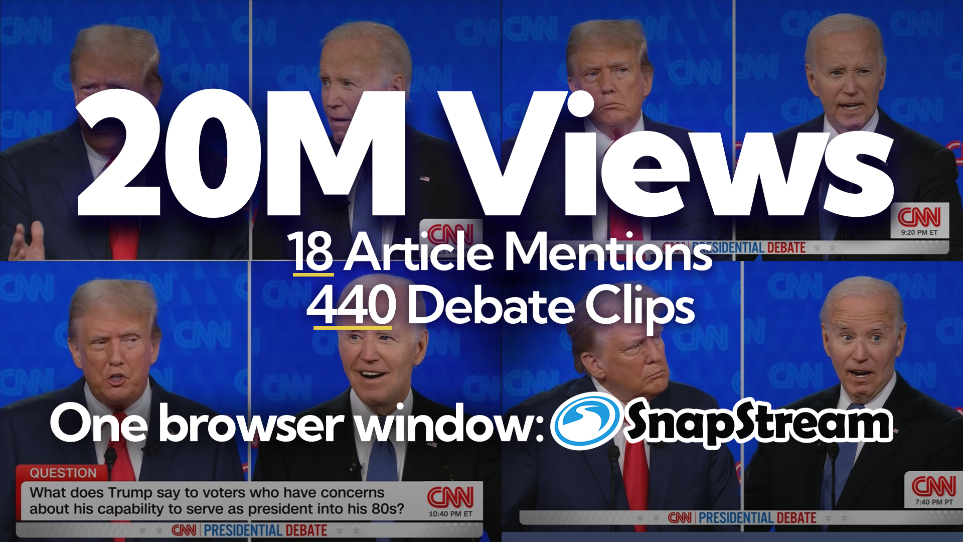 Capturing and holding the audience's attention requires speed and precision. During the first 2024 presidential debate between Donald Trump and Joe Biden, news clippers and journalists in their own right Aaron Rupar and Acyn Torabi leveraged the powerful clipping tool SnapStream to do just that. Their efforts led to over 20 million views on 80 different clips. and significant media coverage, making this a prime example of how real-time digital journalism is conducted.